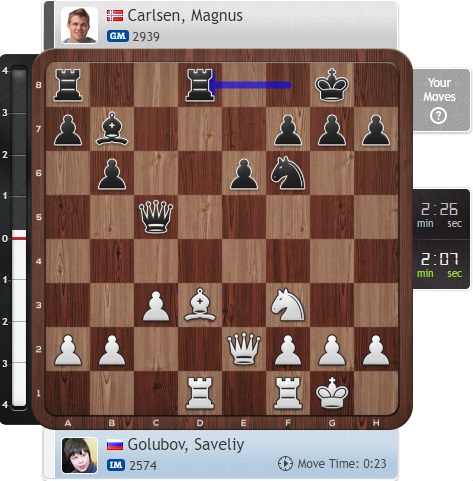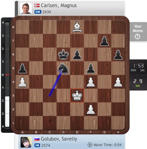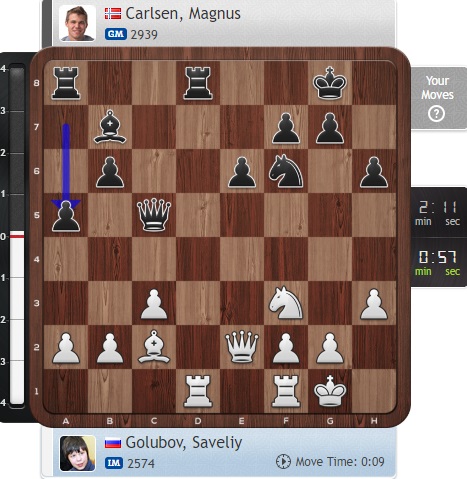 В цейтнот попал Голубов, еще и ошибся разок. Теперь позиция Карлсена предпочтительнее!