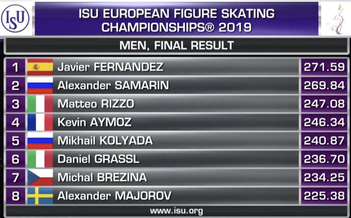 Хавьер Фернандес — семикратный чемпион Европы! Это была славная карьера, Хави. А мы также поздравляем Александра Самарина с небывалыми для него высотами — серебро. Третьим стал итальянец Маттео Риццо, который выступал даже не в сильнейшей разминке. Худшее выступление из россиян показал Максим Ковтун, финишировавший в итоге на 14 месте. А Коляда — пятый. В первую очередь, конечно, мы желаем Михаилу здоровья.