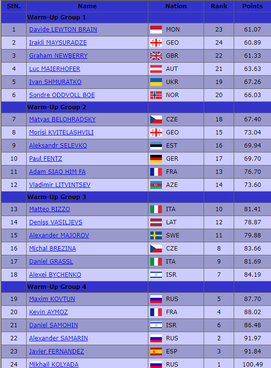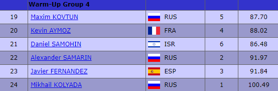 Напомним, что лидером после короткой программы является россиянин Михаил Коляда (100,49 балла). Он, а также Александр Самарин и Максим Ковтун выступят в четвертой разминке.