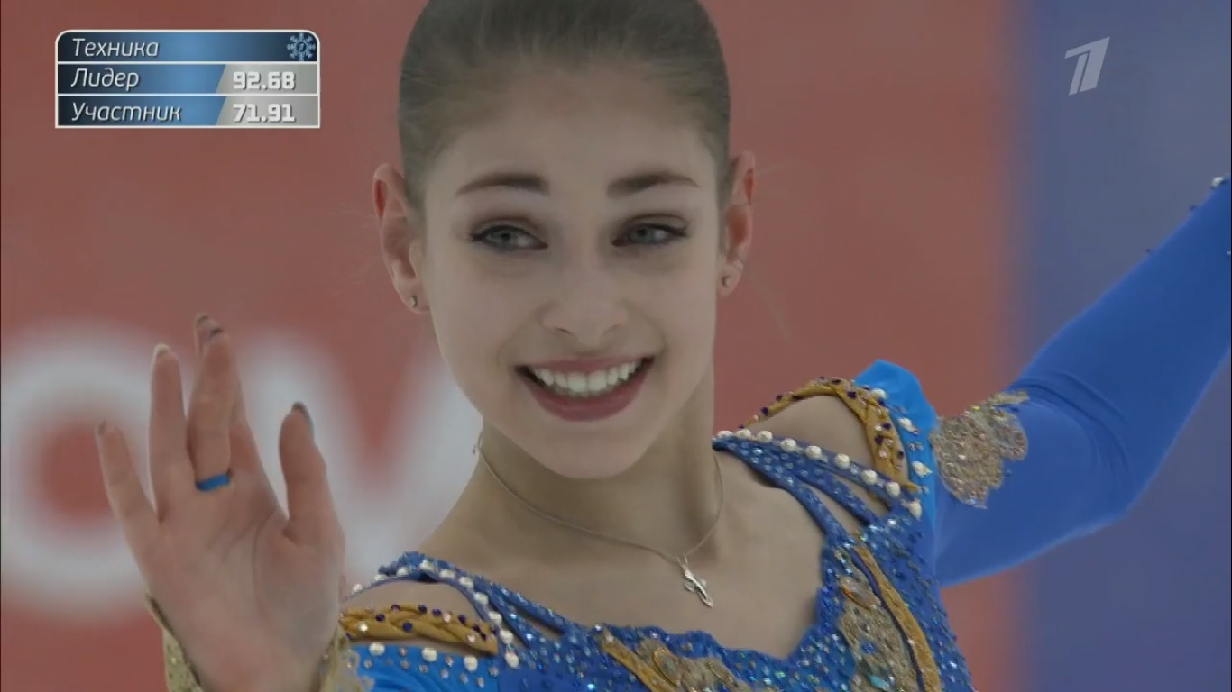 Сделала Саша и не получившийся в короткой каскад тройной лутц — тройной риттбергер. 164,44 за этот прокат и 233,99 в сумме. Первое место. Кто обойдет? И обойдет ли кто-то? Нет, вы вдумайтесь: 233,99!!!