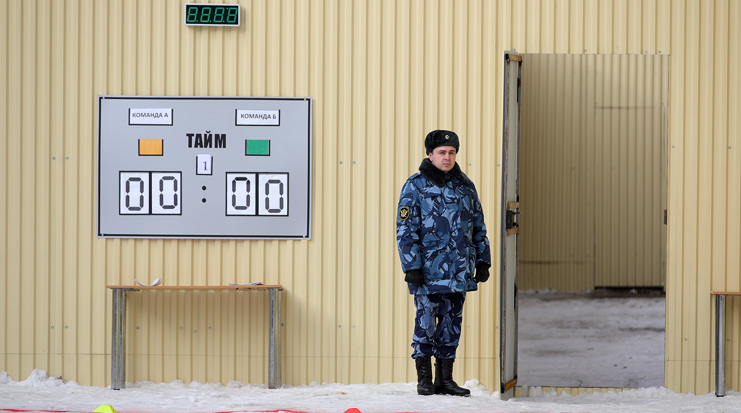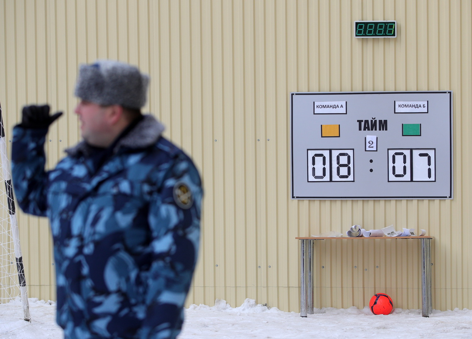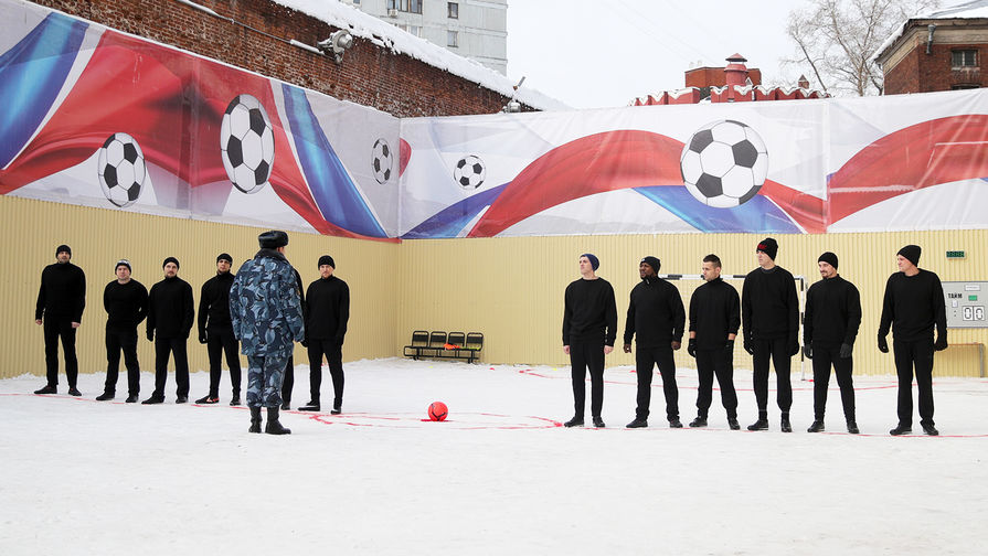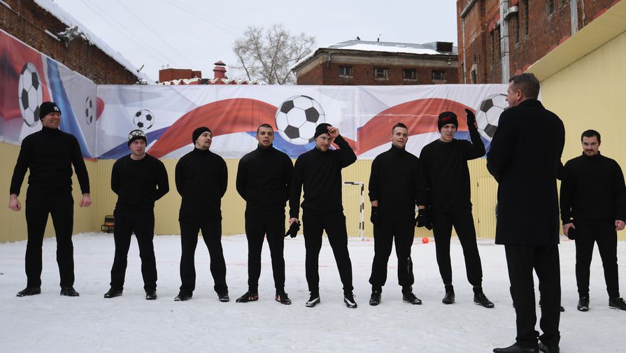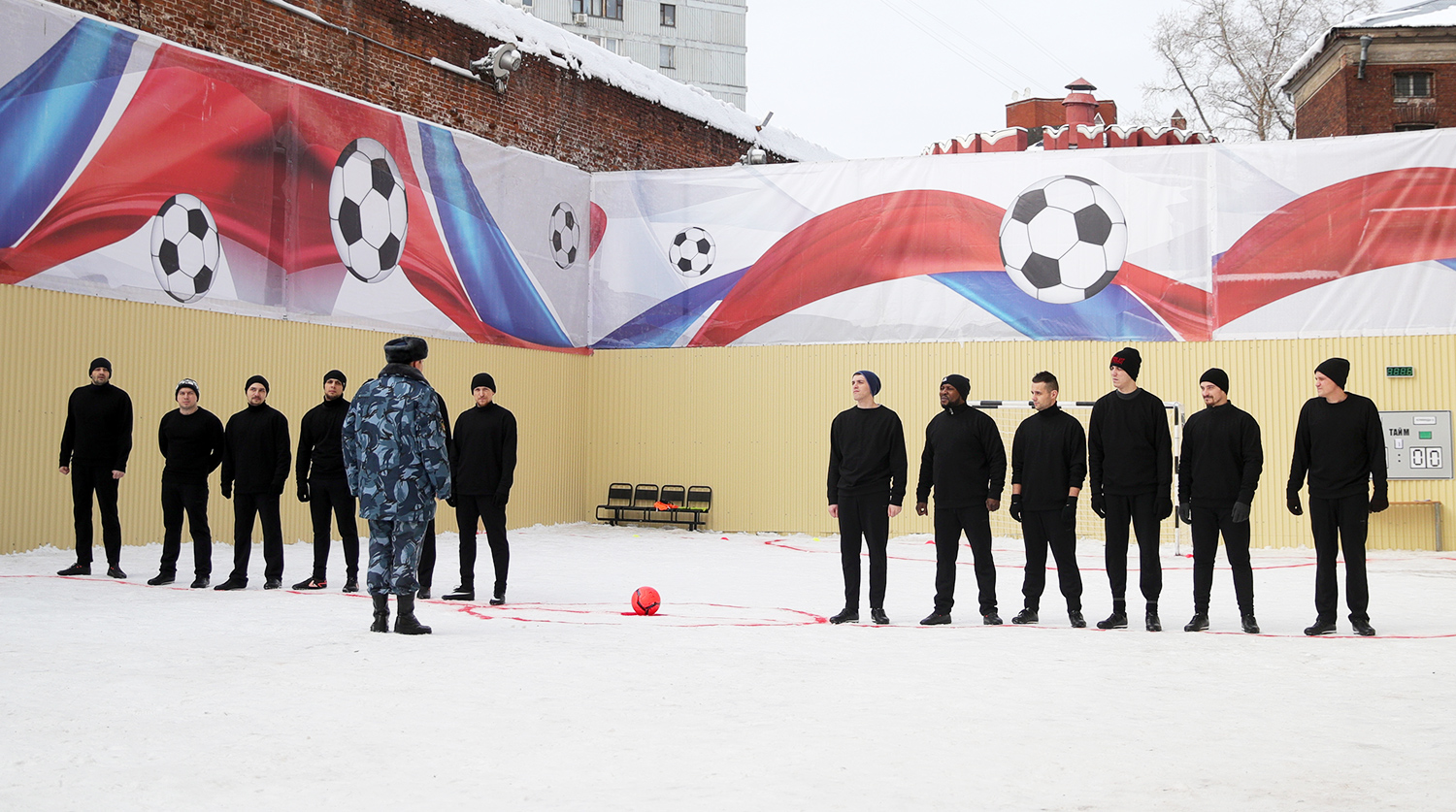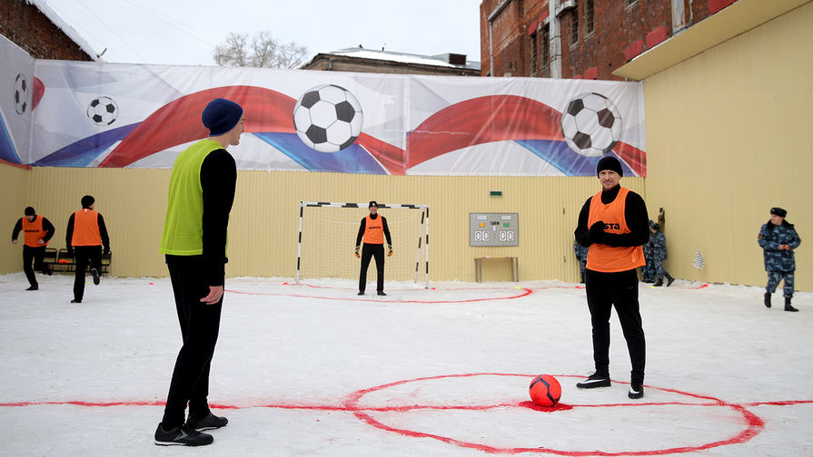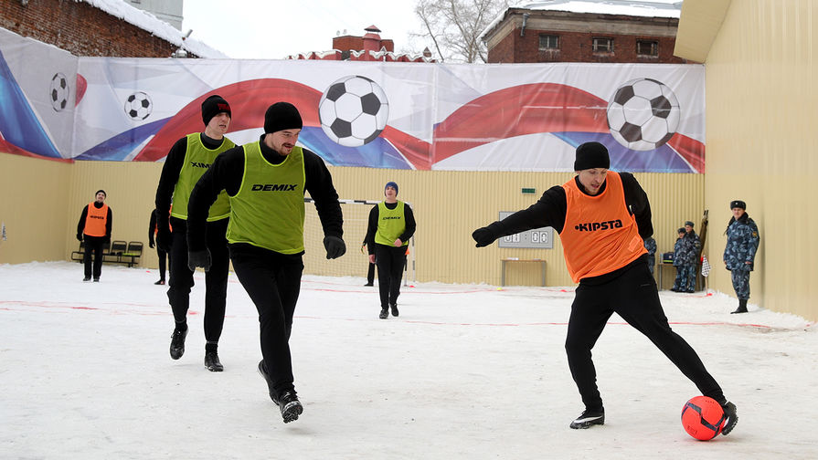 Сергей Бобылев/ТАССКстати, специально для этой встречи на плацу сделали красивую разметку красным цветом. Футболисты играют оранжевым мячом, который лучше всего видно на снегу. Также в СИЗО завезли неплохие ворота и украсили стены большими плакатами с изображением футбольного мяча.