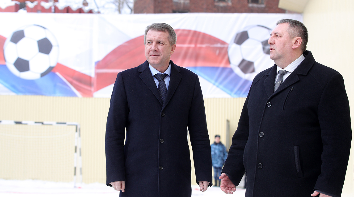 Заместитель директора ФСИН России Валерий Максименко и руководитель УФСИН по Москве Сергей Мороз (слева направо) перед началом футбольного матча в Бутырском СИЗО №2 с участием футболиста П.Мамаева