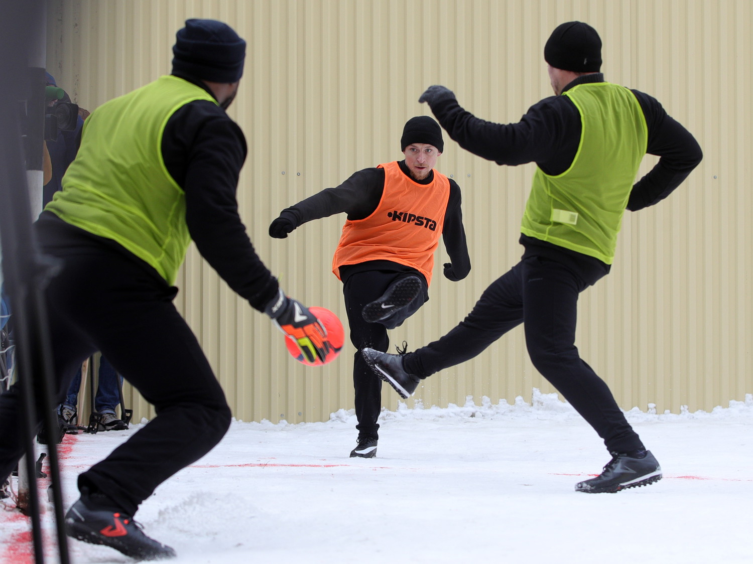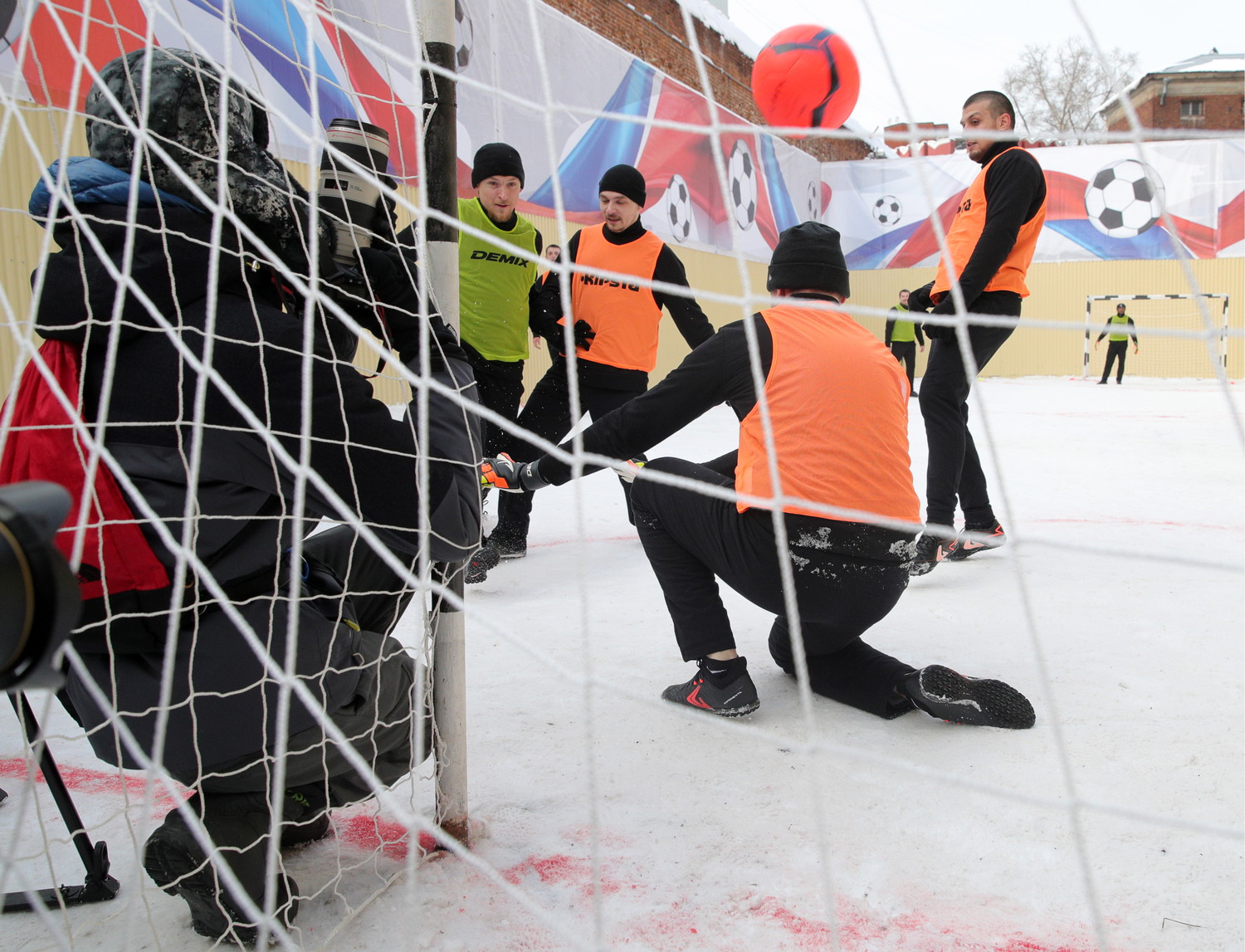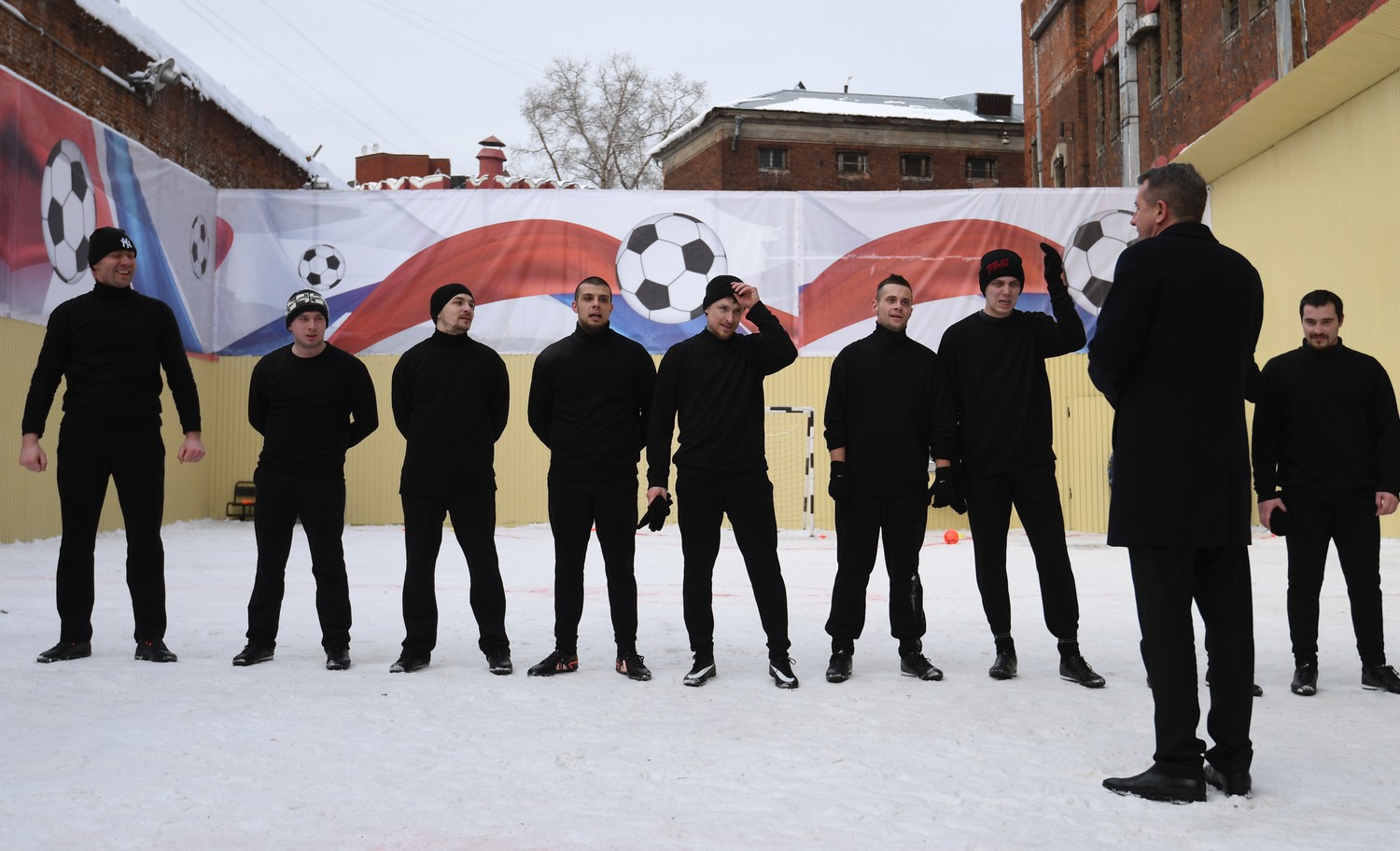 Итак, команды уже выстроились на снежном плацу в ожидании встречи! Сотрудники СИЗО не стали расчищать поле для игры — нас ждет жесткий дворовый футбол.