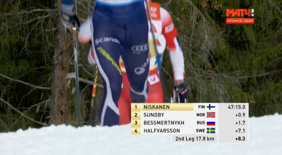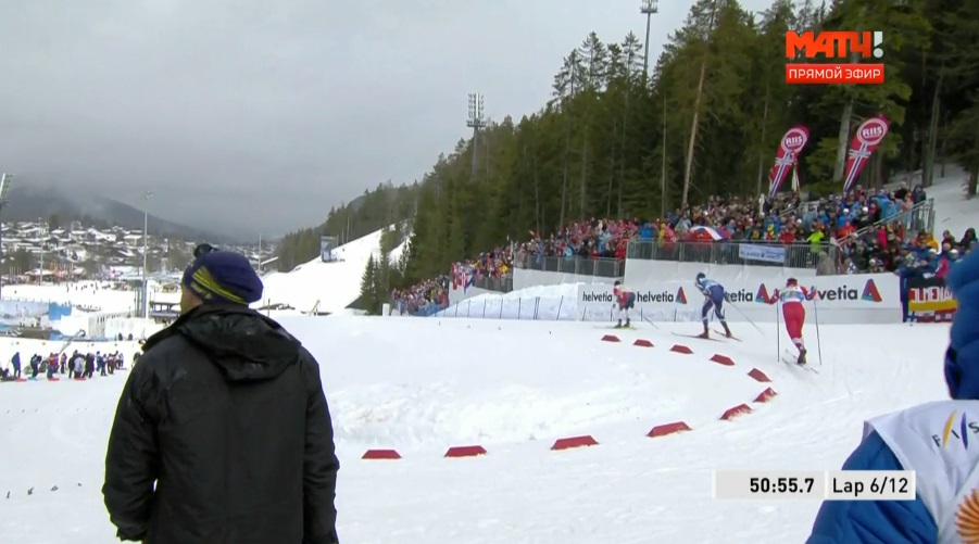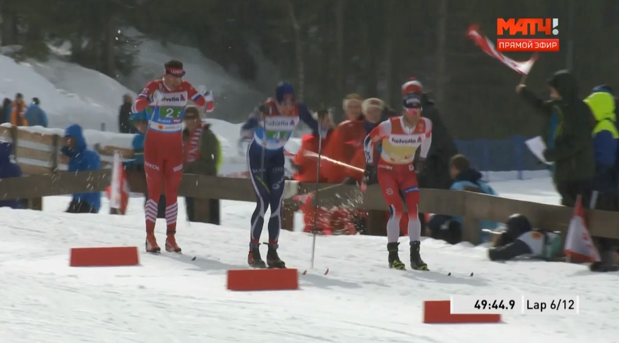 А у нас тем временем произошел переворот! Норвежец Сундбю, швед Халфварссон и финн Нисканен резко рванули вперед и заняли первые три строчки по итогам 12,5 км. Бессмертных же откатился на седьмую позицию, но пока держится в самом хвосте лидирующей группы. Ни в коем случае не отпускать!
