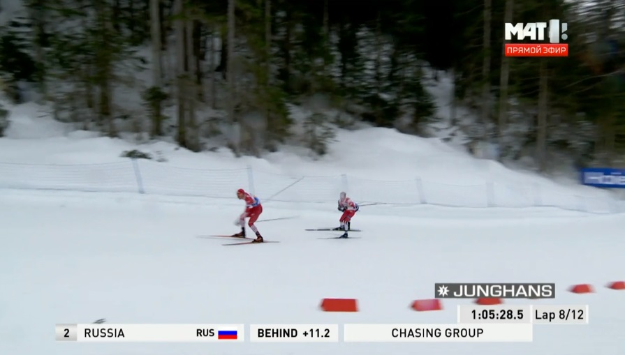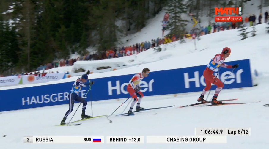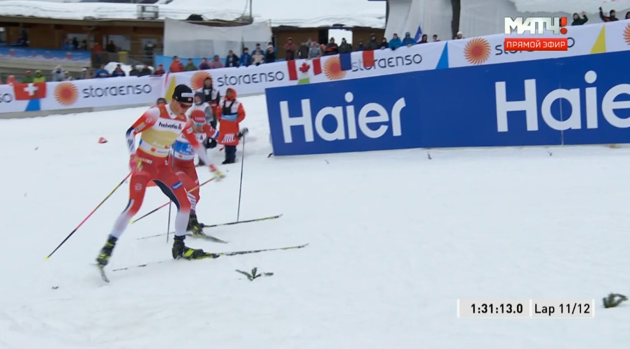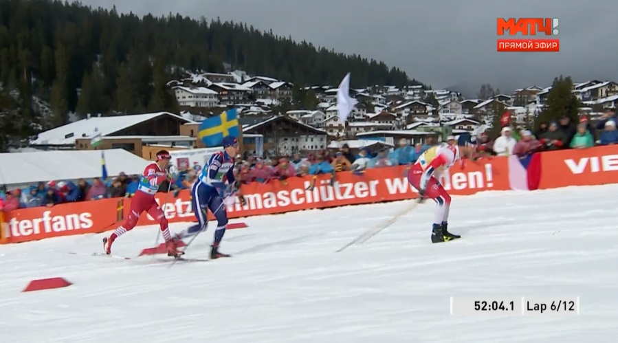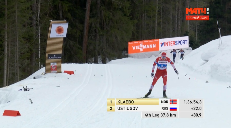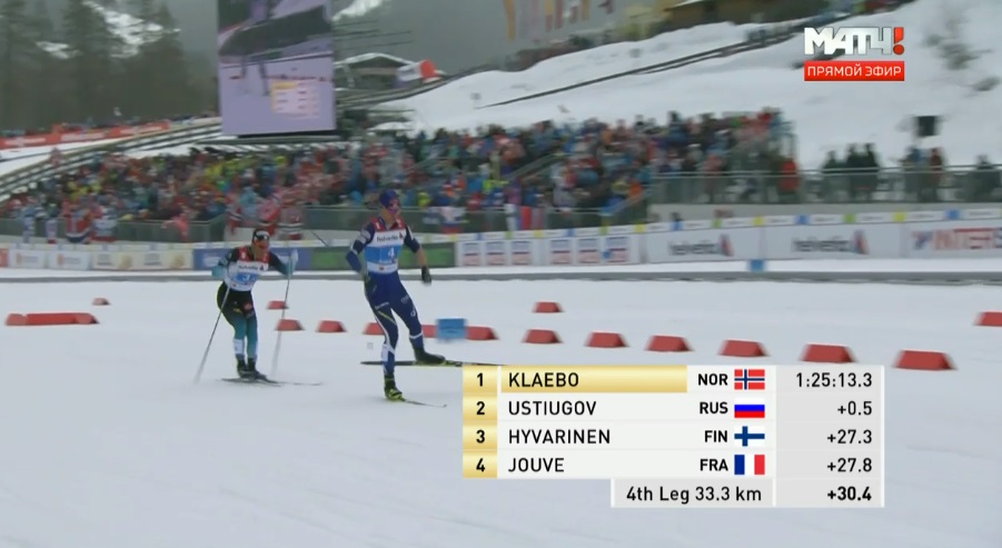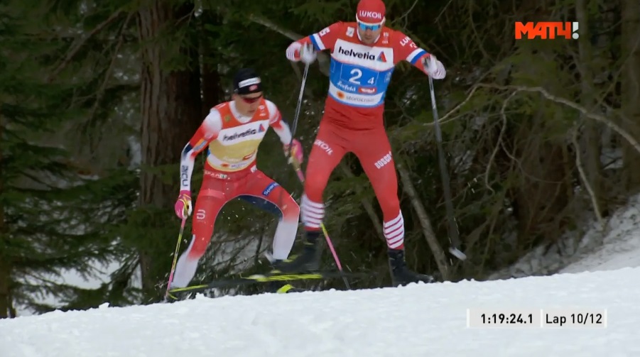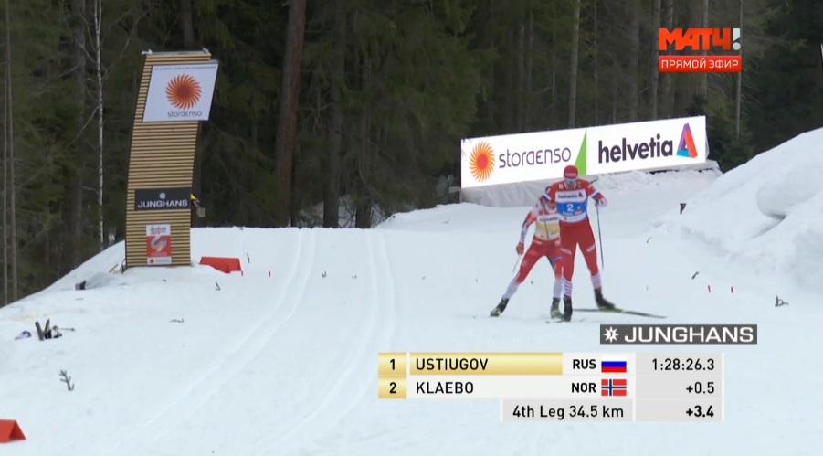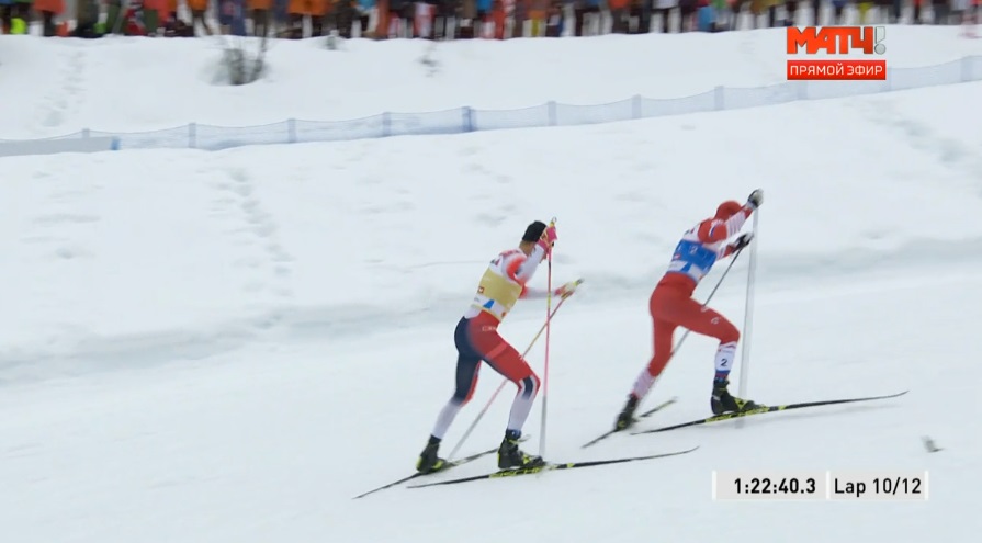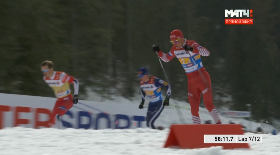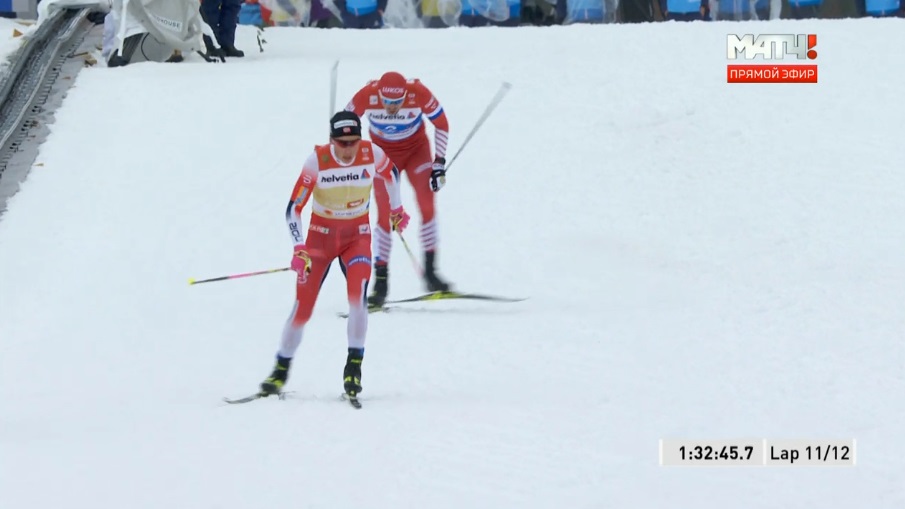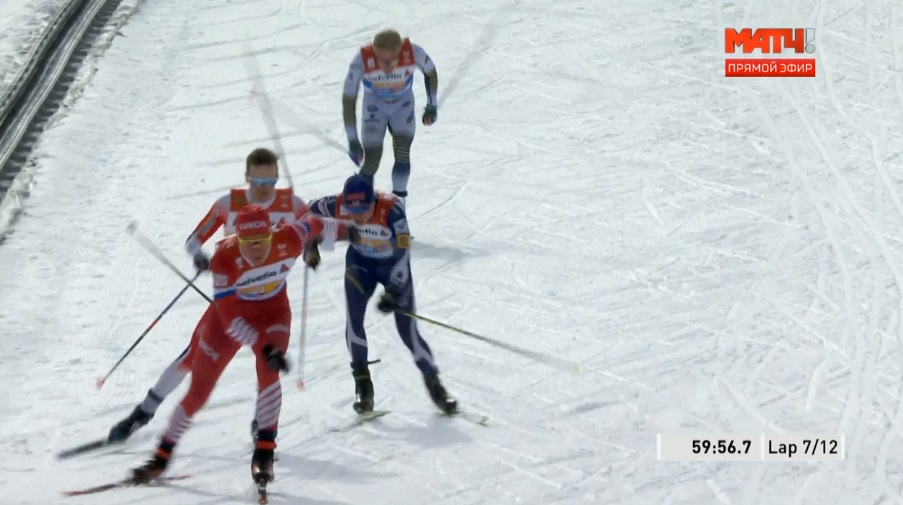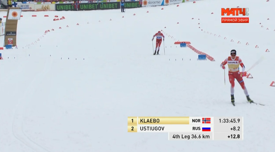 Первый круг окончен из трех. На финишной прямой чуть впереди был Клэбо, но дальше снова Устюгов потянул за собой.