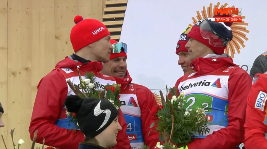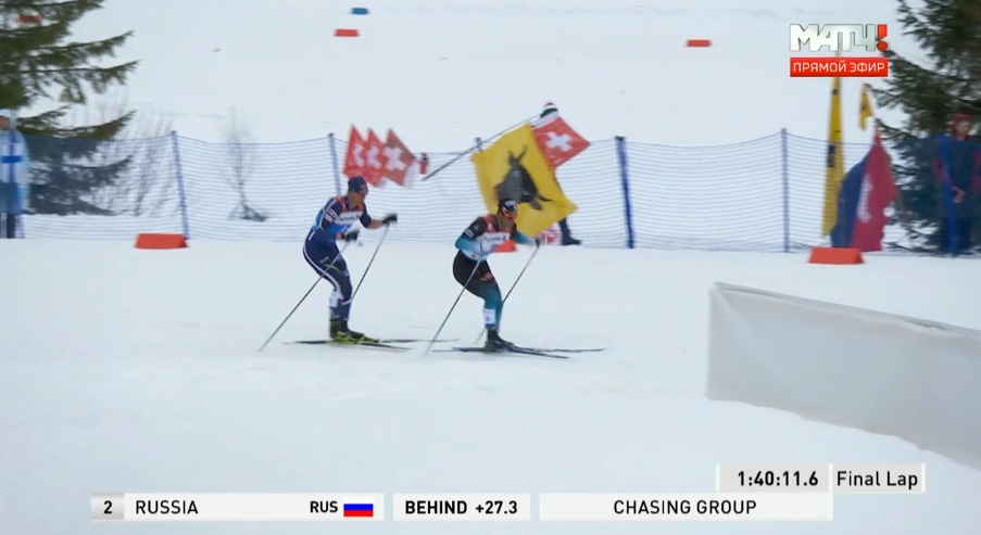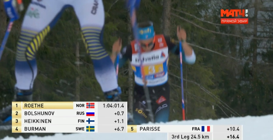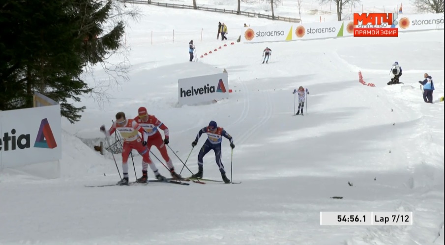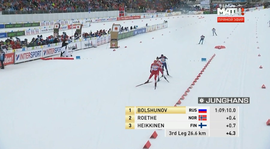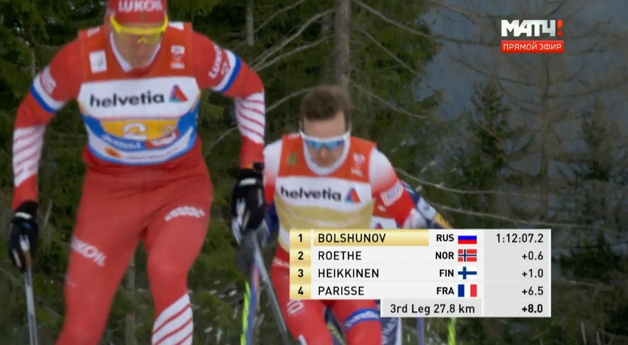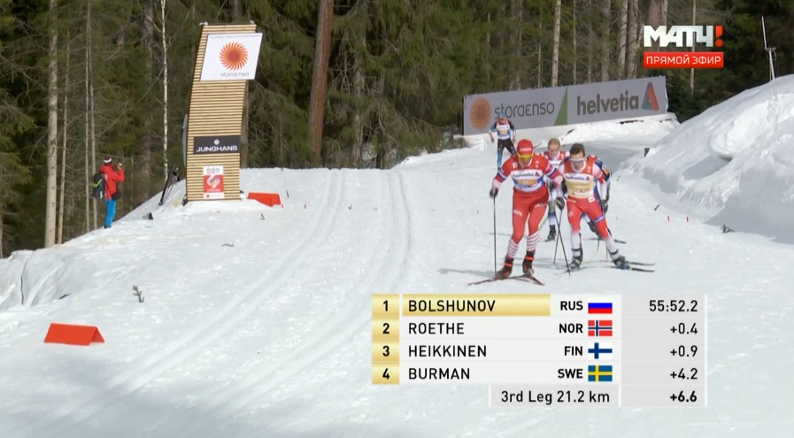 Хорошо отработал свой этап Бессмертных. Теперь Александр Большунов против Шура Рёте и Матти Хейккинена.