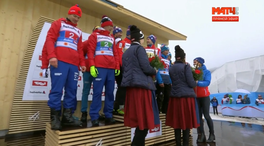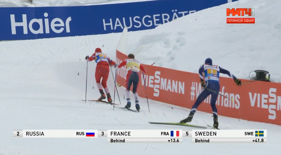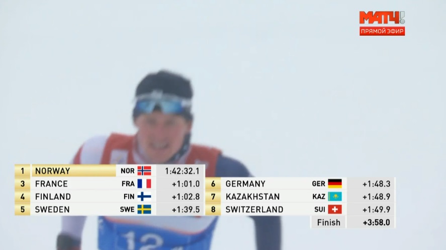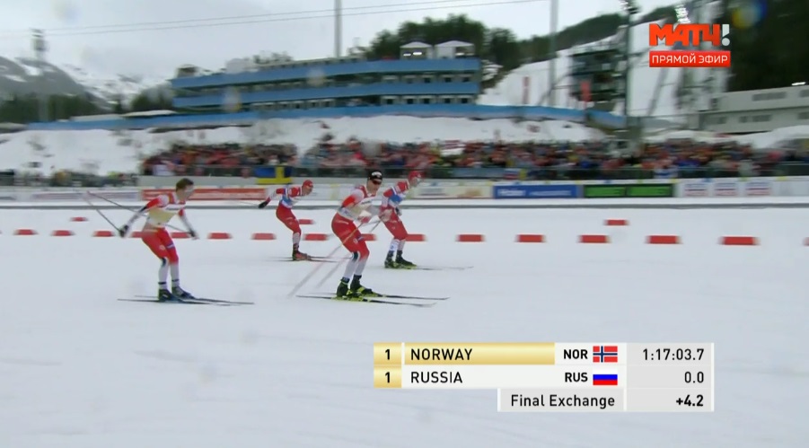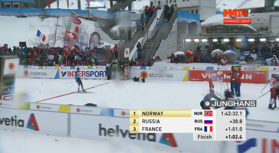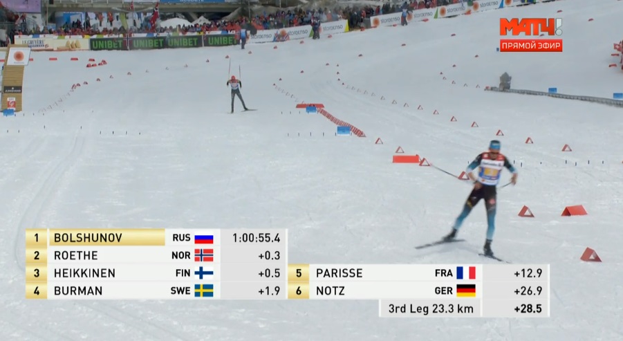 Произошла передача эстафеты! За Россию теперь бежит Александр Бессмертных. Браво Андрею Ларькову за отличный первый этап — долго держался в середине, но в конце так рванул, что финишировал лидером. Вторыми «передались» норвежцы — теперь на трассе бежит Мартин Сундбю. Третьи — немцы.