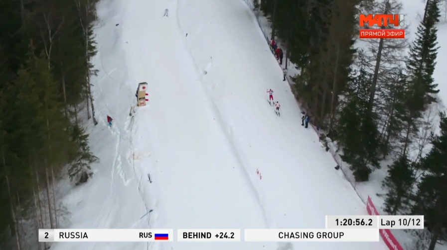Начинается тяжелый подъем с поворотом. Тем не менее большинство лыжников пока держатся в общей группе. Что ж, это только второй круг эстафеты из 12-ти. Тем временем на отметке 4,5 км Ларьков стал вторым после разрывающего пока все и вся канадца Алекса Харви. Надо держаться в лидерах! Хотя терпеть еще долго.