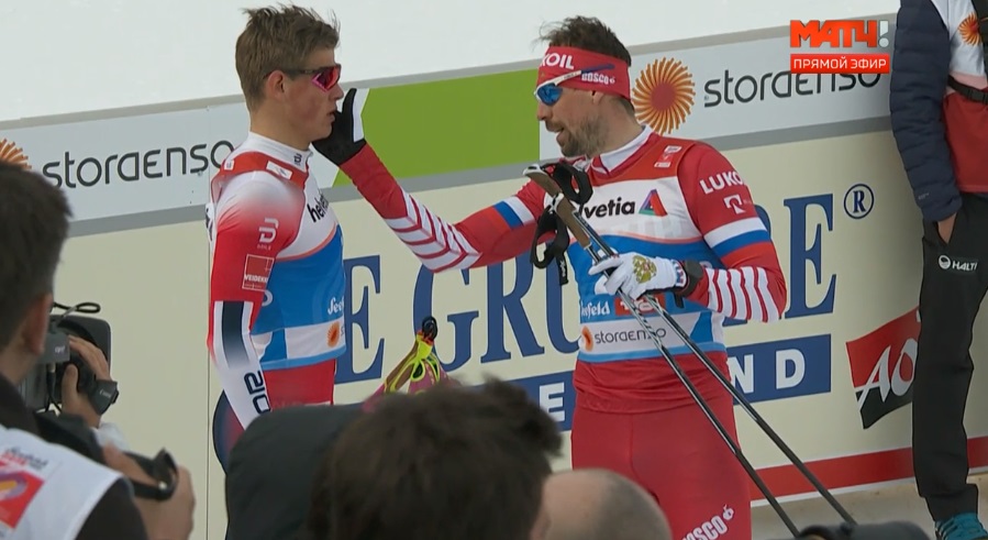 А режиссер трансляции напоминает нам об уже знаменитой стычке россиянина и норвежца после полуфинала в личном спринте, когда Клэбо наступил Устюгову на лыжу, из-за чего наш спортсмен в итоге не вышел в финал. Клэбо вышел и стал чемпионом мира.