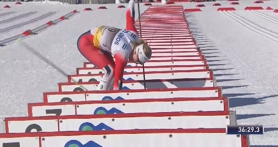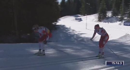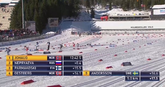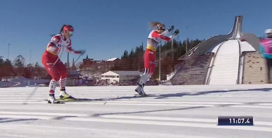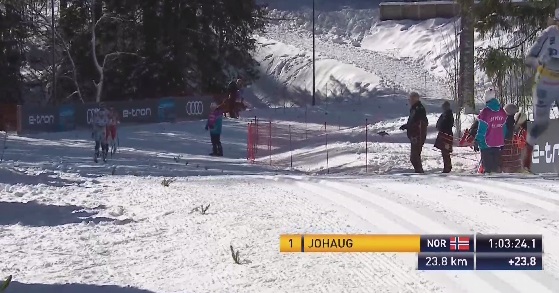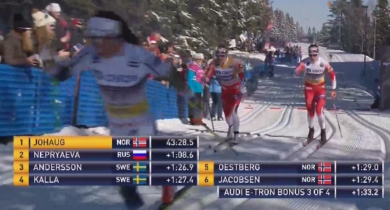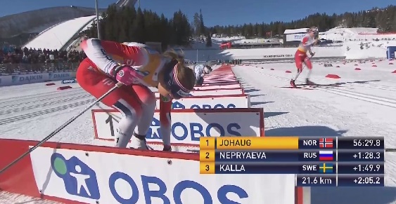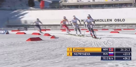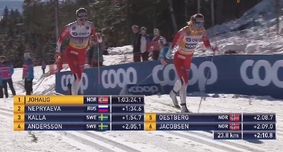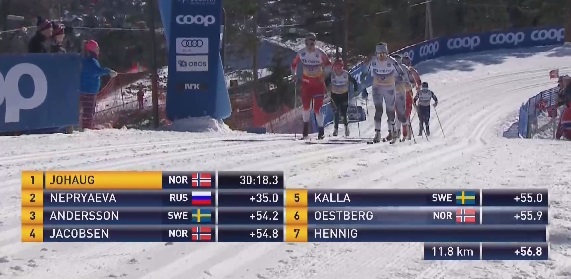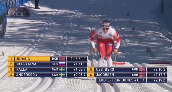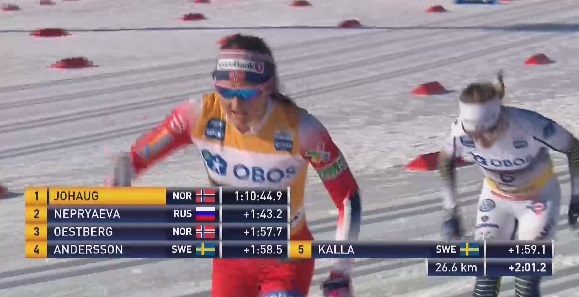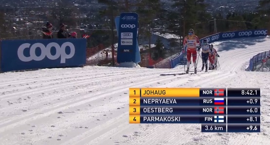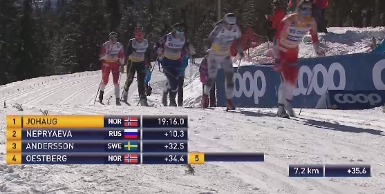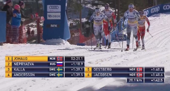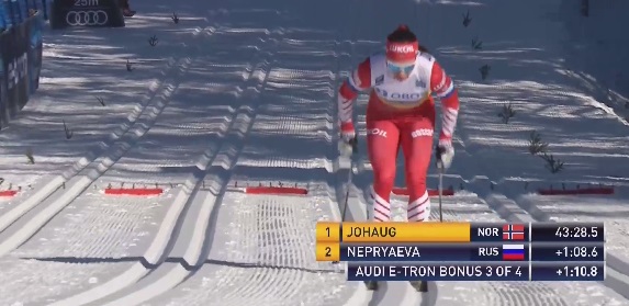 Очередная отсечка. Держится Непряева за Йохауг, хотя уже сейчас это становится крайне тяжелой задачей. А ведь только начало гонки. И это была первая бонусная отсечка. Наталья молодец.