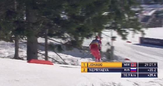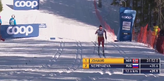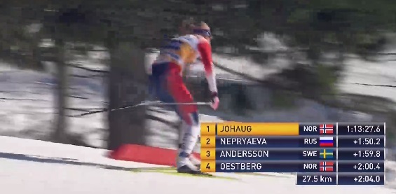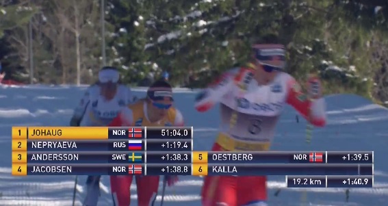 По-прежнему Йохауг очень мощно работает. 59 секунд уступает ей Непряева. И, кажется, к ней немного подтянулись преследовательницы. Хотя нет — 23 секунды. Нормально. Еще полгонки впереди.