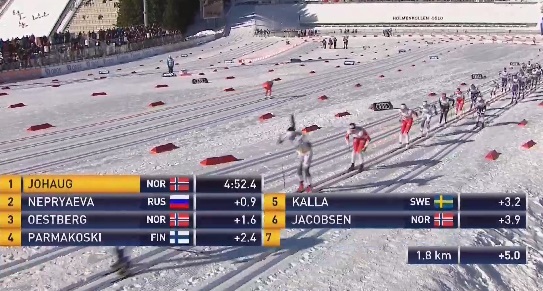 Первая отсечка. 1,8 км. Йохауг первая, за ней бегут Непряева, Эстберг, Пярмякоски, Калла... Все ожидаемо. Как на недавнем чемпионате мира пока все.