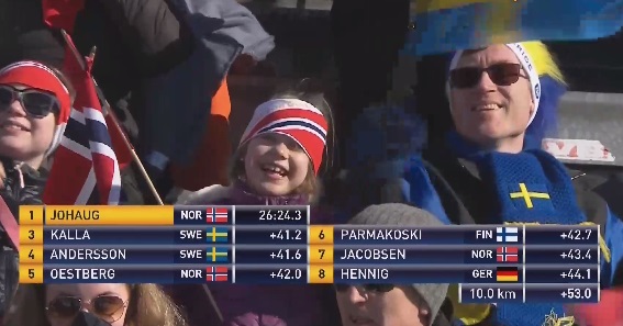 10 км. Йохауг бежит, будто это спринт какой-нибудь... Непряева уже в 23 секундах позади.