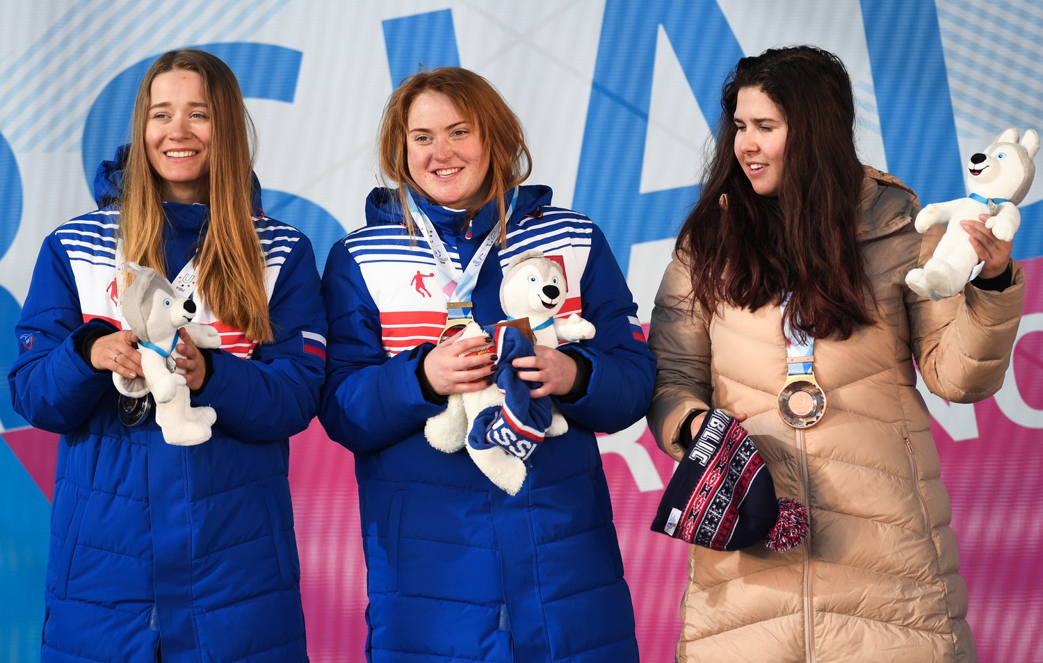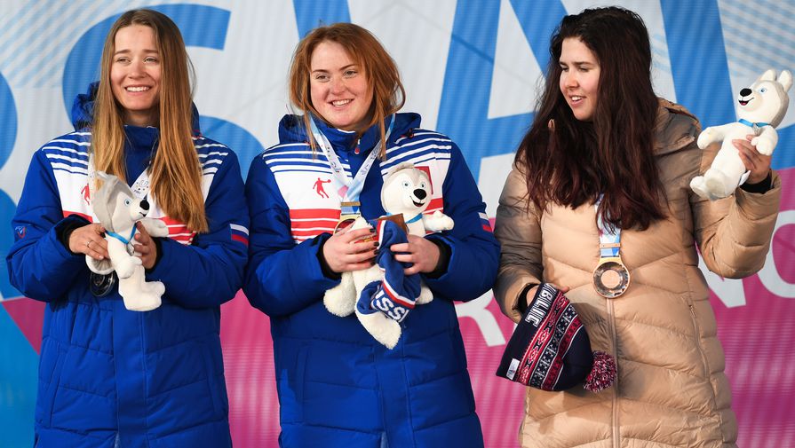 Победительницы фристайла в ски-кроссе на Универсиаде в Красноярске: Анна Антонова (Россия), Екатерина Мальцева (Россия), Клара Кашпарова (Чехия)