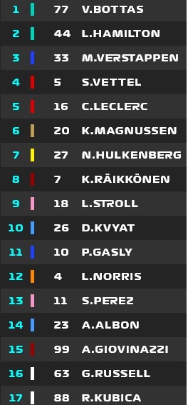 1. Боттас, 2. Хэмилтон, 3.Феттель, 4. Ферстаппен, 5. Леклер, 6. Магнуссен, 7. Грожан, 8. Хюлькенберг, 9. Райкконен, 10. Норрис, 11. Албон, 12. Перес, 13. Стролл, 14. Сайнц, 15. Квят, 16. Гасли, 17. Джовинацци, 18. Расселл, 19. Кубица, 20. Риккардо.