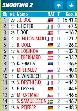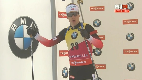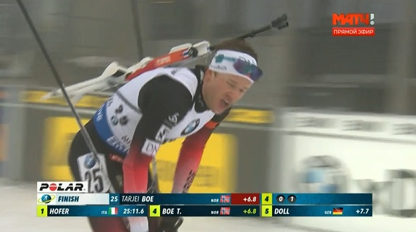 Тарьей Бё финиширует. Четвертый пока с одним промахом. Но сейчас брат подойдет.