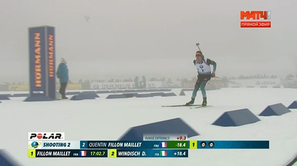 Туман нормальный, правда? Но Виндиш закрывает все пять мишеней. Как и Фийон-Майе. А вот Самэульссон бежит на круг.