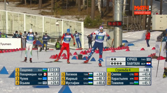 Филимонов!!! Идеальная стрельба. А вот Латыпов буксует, дополнительный патрон задействовал и проиграл еще порядка 15 секунд. Преследует их Семаков.