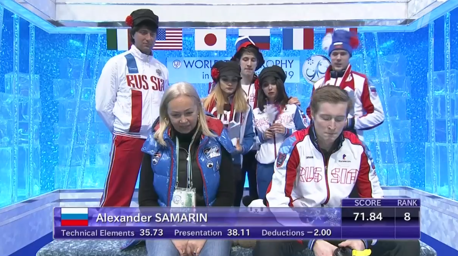 «Прям такой спокойный, хороший прокат, каждый элемент. Как будто даже и не боролся, а просто умеет делать. Он так вырос за этот год, что я просто его не узнаю — вот что делают соревнования с человеком. Очень хорошо. Видно, над чем люди работают. Мальчик за целый год встал на ноги. От первых прокатов и до сегодняшнего дня — совершенно другой человек. Поздравляю Алексея Николаевича Мишина. Это здорово, одно удовольствие», — не нарадуется Татьяна Анатольевна.