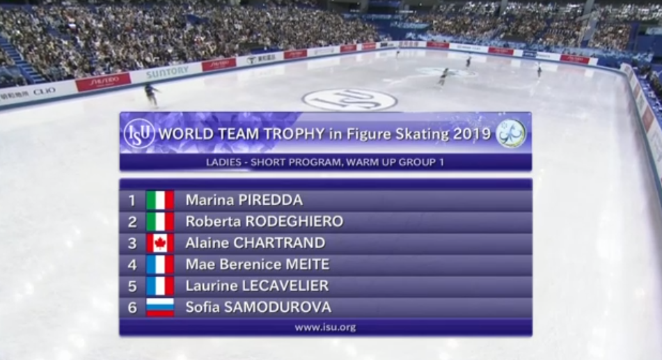 Всего с короткой программой выступят 12 фигуристок. В первой разминке участвуют: Марина Пиредда (Италия); Роберта Родегьеро (Италия); Ален Шартран (Канада); Маэ-Беренис Мейте (Франция); Лорин Лекавелье (Франция); Софья Самодурова (Россия).