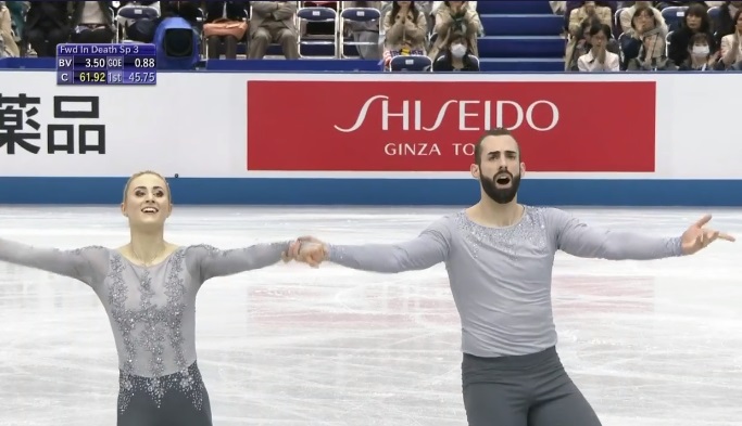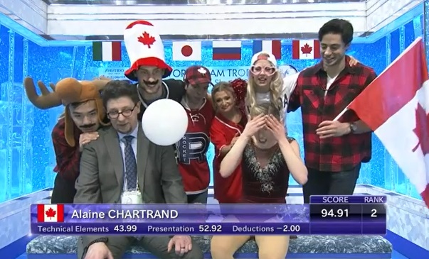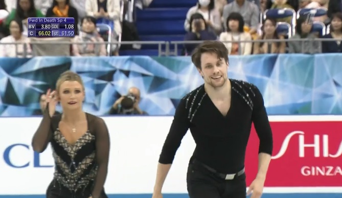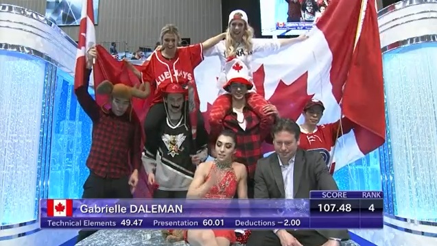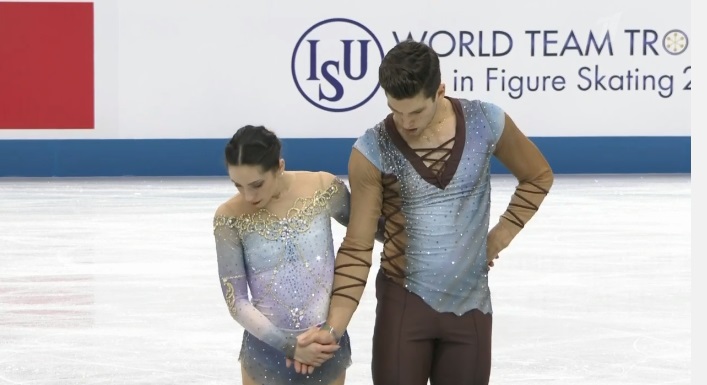 Каскад 3 сальхов — 2 тулуп — 2 тулуп в начале после твиста, потом выброс риттбергер с красивого захода — уже начало выступления показало, что канадцы покажут солидный результат. Почти все элементы были выполнены на плюсы, а зал с середины проката непрерывно аплодировал паре. Правда, партнер один раз упал.