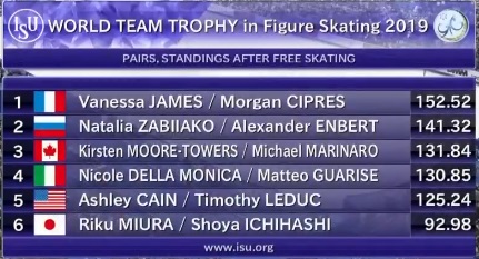 1. Рику Миура – Сойя Ичихаши (Япония) 2. Эшли Кэйн – Тимоти ЛеДюк (США) 3. Кирстен Мур-Тауэрс – Майкл Маринаро (Канада)