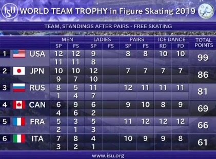 А вот турнирное положение. Надо 5 баллов у японок отыгрывать в женском катании. Невероятно сложно. Ждем заключительного вида.