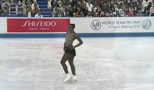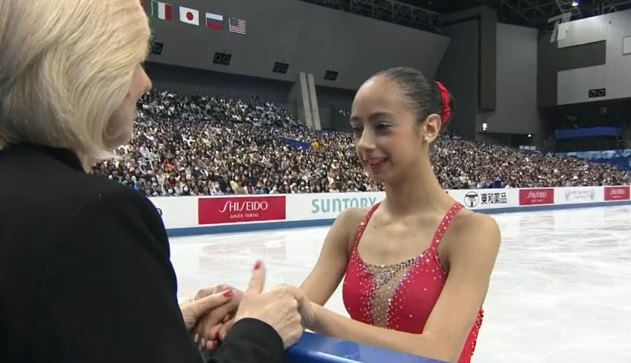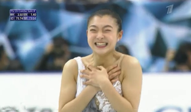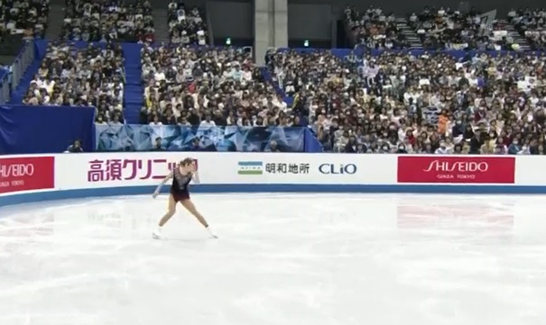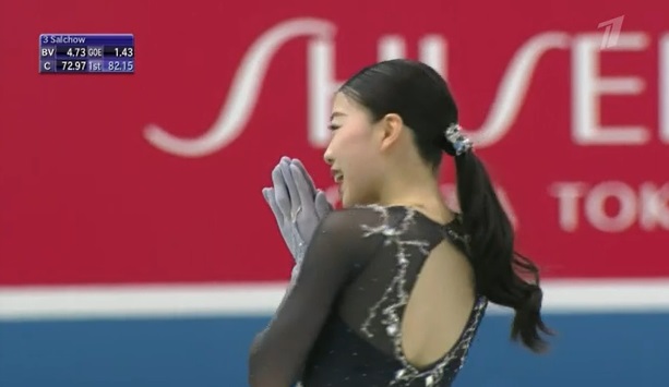 Упала с тройного акселя сразу же! Все же очень нестабилен этот элемент у японки. Во второй части программы плохо прыгнула каскад 3 лутц — 3 тулуп. С остальным справилась, но второй раз тройной аксель прыгать уже не стала. Должна проиграть Туктамышевой!