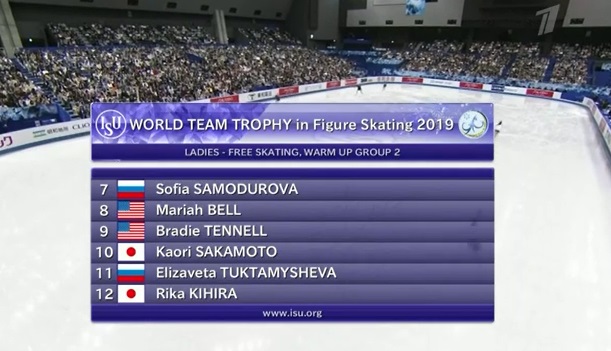 7. Софья Самодурова (Россия) – 11.53 по московскому времени 8. Мэрайя Белл (США) 9. Брэди Теннелл (США) 10. Каори Сакамото (Япония) 11. Елизавета Туктамышева (Россия) – 12.24 по московскому времени 12. Рика Кихира (Япония)