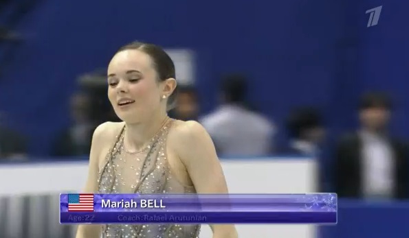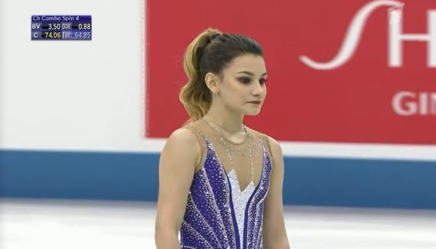 Начала юная итальянка с каскада 2 аксель — ойлер — 3 сальхов, но затем не смогла как следует зайти на лутц и сделала только один оборот. Не расклеилась и выдала следом два тройных прыжка. Хороша была и во второй части, где прыгнула и каскад, и тройной лутц. Очень бодрое выступление Марии. Обойдет Мейте.