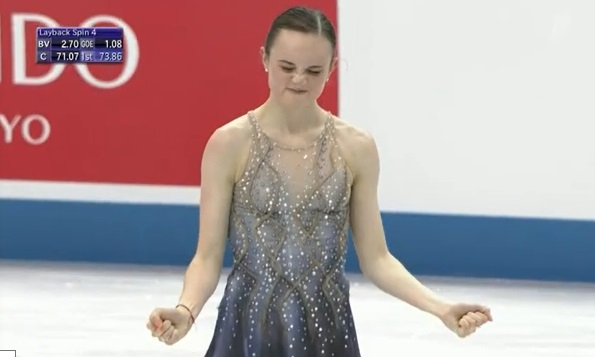 Довольно неплохо справилась со своим прыжковым контентом в первой части проката, пусть он и не является максимально сложным. Получили четвертые уровни за дорожки шагов и вращения. А вот во второй части упала с тройного лутца, но не расклеилась и тут же сделала тройной сальхов. Достойный прокат.