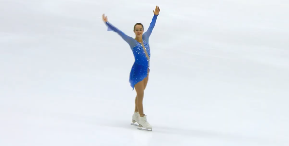 Фух, тройной сальхов под конец программы исполнен чисто. Хотя бы финальная точка получилась позитивной. А вообще программа очень даже неплохая: оригинальная музыка, редко используемая в ФК и навевающая настроение светлой грусти, воздушное платье насыщенного голубого цвета — все подобрано идеально.