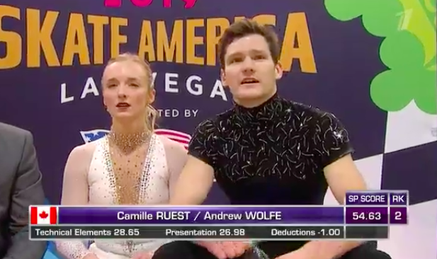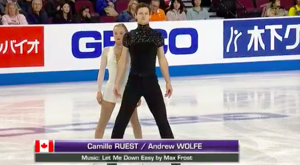 На льду — канадцы Камиль Руэст / Эндрю Вулф! Они выступают под «Let Me Down Easy» в исполнении Max Frost.