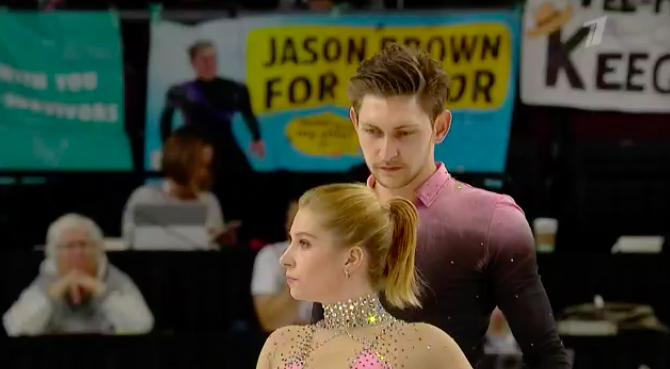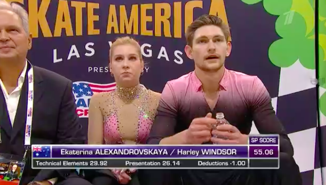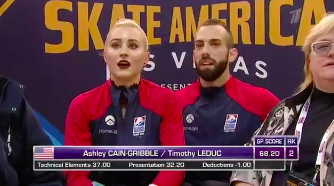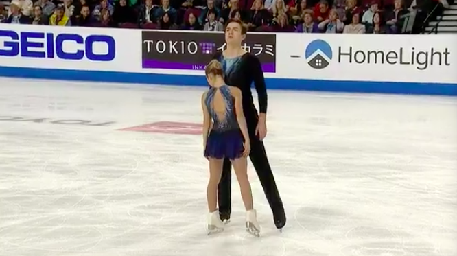 Американцы начали с отличной тройной подкрутки. Кстати, на своем предыдущем турнире они обошли сильный российский дуэт Евгения Тарасова / Владимир Морозов, так что соперники они непростые.