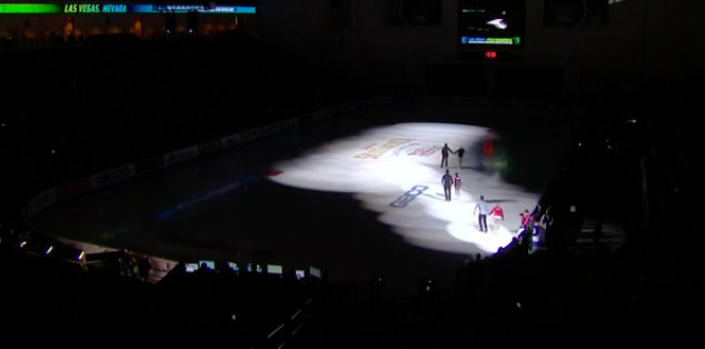 Фигуристы первой группы выходят на разминку! Выглядит это впечатляюще — свет прожекторов словно пробивает им путь на льду.