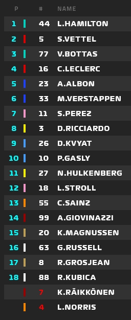 1.Хэмилтон, 2.Феттель, 3.Боттас, 4.Леклер, 5.Албон, 6.Ферстаппен, 7.Перес, 8.Риккардо, 9.Квят, 10.Гасли.