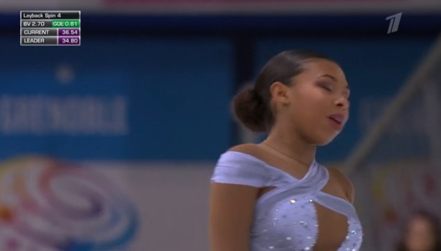 Каскад из тройных тулупов, двойной аксель, тройной риттбергер — отпрыгала достаточно неплохо. Ну и много четвертых уровней на вращениях. Должна 18-летняя американка выйти в лидеры сейчас.