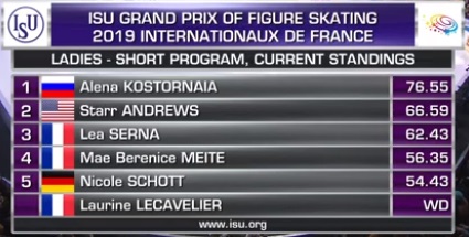 Убедительно побеждают Алена Косторная и Алина Загитова в короткой программе в Гренобле! Жаль только, что Мария Сотскова на 11-м, последнем месте. 12-я участница Лорин Лекавалье снялась за пару дней до турнира.