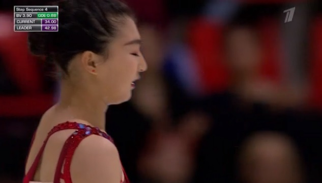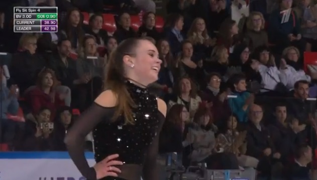 Сделала двойной аксель, затем выполнила каскад 3 лутц — 3 тулуп и тройной флип чисто прыгнула тоже. Довольно интересный прокат, хотя не за все вращения получила четвертые уровни. Дорожка тоже третьего уровня.