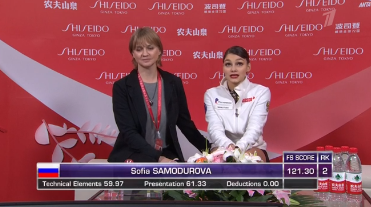 86,44 балла. Лица фигуристки и ее тренера не требуют комментариев.
