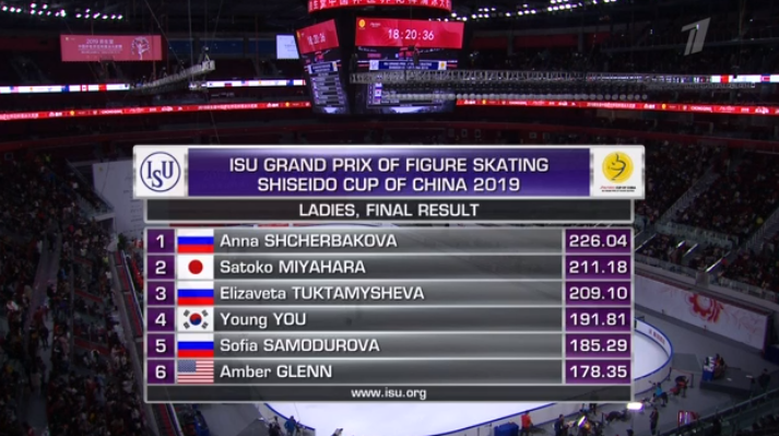 Плохо. К сожалению, очень плохо. Несколько падений у китаянки, масса недокрутов, низкие уровни других элементов. Надбавки если и есть, то совсем мизерные. Тоже прощается с Гран-при.