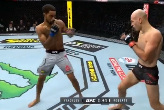 Третий раунд. После маленькой разведки Робертс пошел вперед и опрокинул российского бойца! Впрочем, это был локальный успех. Яковлев сделал несколько удачных действий также, в какой-то момент имел перевес в раунде, однако в итоге Робертс тоже несколько раз попал и закончил бой на российском бойце.