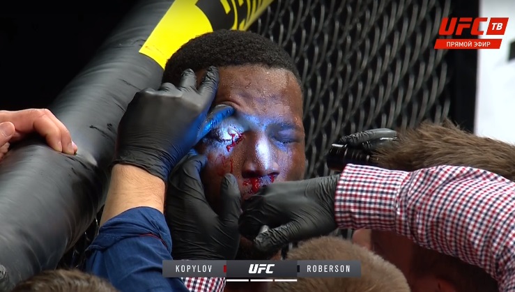 Роберсон говорит, что может продолжать, но у него рассечено веко. Бой продолжится. Очко снимают у Копылова.
