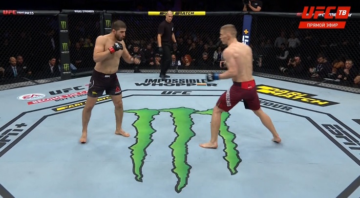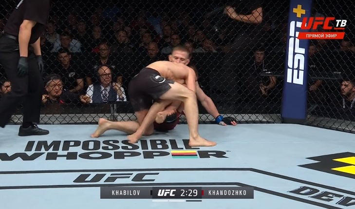Это большой сюрприз! И, кстати, первое поражение Нурмагомедовых в истории UFC. 2:50 продолжался бой.