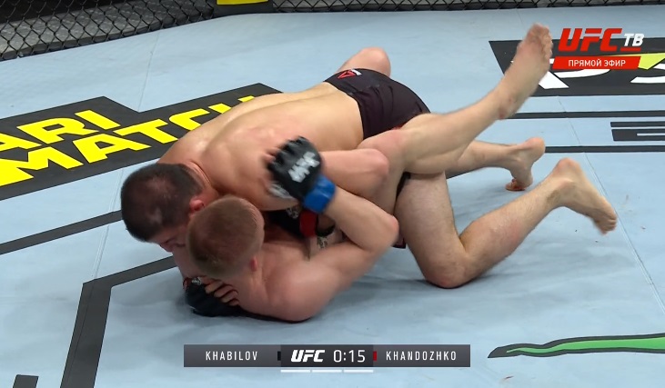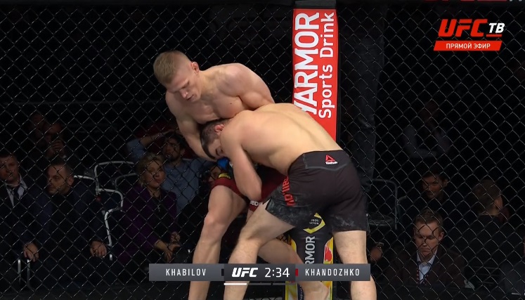 Третий раунд. Хабилов пропустил от Хандожко, попытавшись ударить того ногой, но потом сделал тейкдаун. Через какое-то время Хандожко поднялся, и все повторилось: пропущенный Хабиловым удар после своей атаки и следом его же тейкдаун. И дальше был контроль до конца раунда.