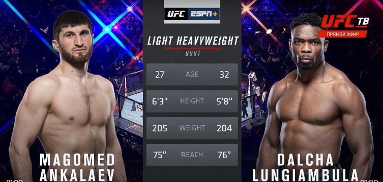 А теперь громадный африканец Далча Лунгиамбула из ДР Конго сразится с россиянином Магомедом Анкалаевым.