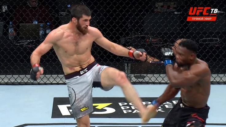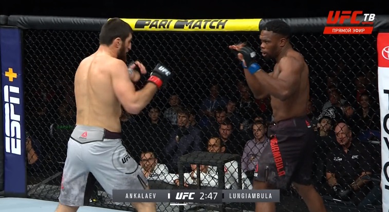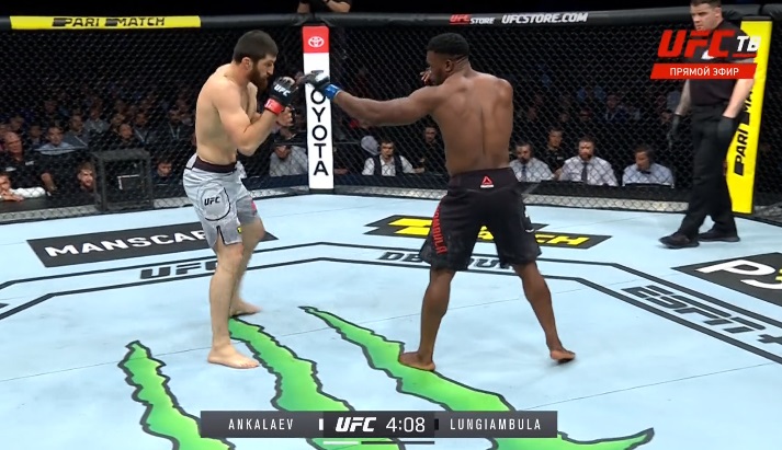 НОКАУТ! Сразу же попробовал несколько раз нокаутирующие панчи выбросить Лунгиамбула, но не попал. А вскоре сумасшедший фронткик провел Магомед Анкалаев! Африканец не упал после страшного удара, но тут же его безжалостно добил россиянин!