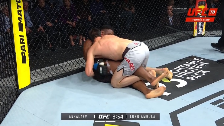 Второй раунд. Подустал Лунгиамбула, и уже на второй минуте сделал Анкалаев тейкдаун. После этого россиянин давил соперника на канвасе очень долго. В очень тяжелом положении оказался конголезец. В одну калитку идет бой. 46-0 по ударам в партере. Бровь рассечена у Лунгиамбулы. Но будет третий раунд. После четырех минут давления в партере от Анкалаева.