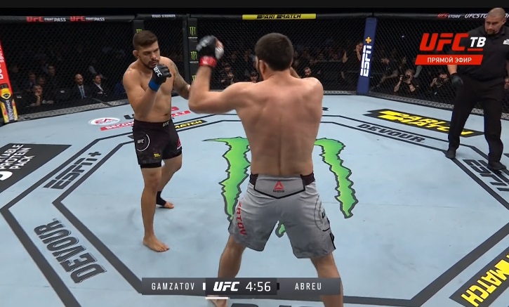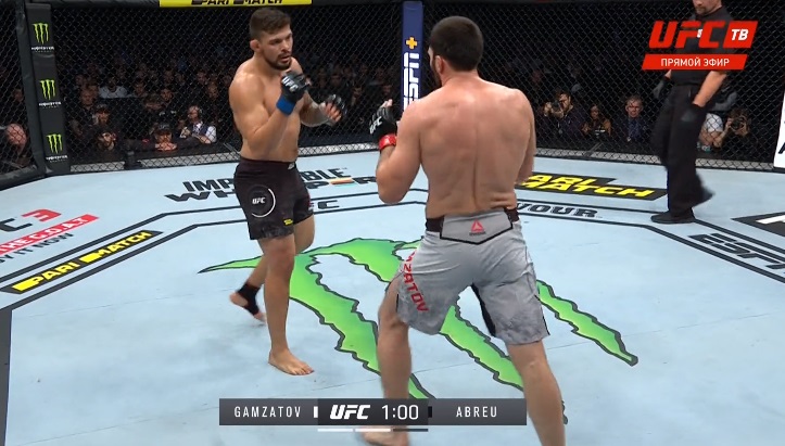 Первый раунд. Осторожное начало от соперников. Работали мидлкиками, прощупывали друг друга. Только на четвертой минуте Абреу зарядился на хайкик, но промахнулся. В целом Клидсон вроде бы поддавливал, но бил в основном в ответ. Скорее за Гамзатовым первый раунд, но пока очень скучно все и достаточно равно.