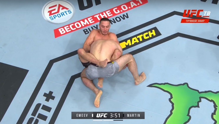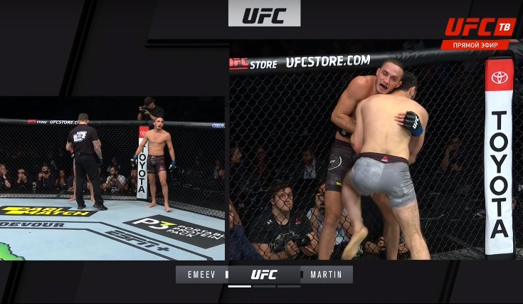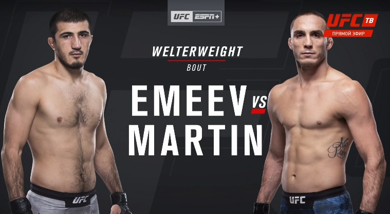 Первый раунд. В хорошем темпе сразу же стали работать бойцы. В конце первой минуты американец слегка болтанул Эмеева ударом. На второй минуте Эмеев попробовал сделать тейкдаун, но попался на захват соперника, который был близок к тому, чтобы сделать болевой. Правда, в итоге Эмеев не просто отбился, а сам перешел в позицию сверху. Мартин встал играючи.